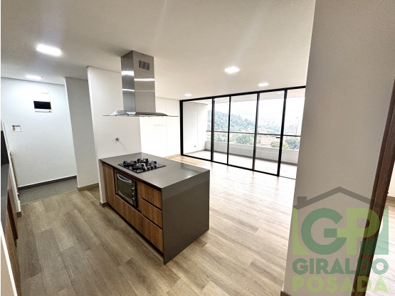 área 74 mt2, 2 alcobas amplias, la principal con baño y vestier, baño social, sala comedor, balcón amplio, cocina integral con red de gas, campana en isla, piso en madera laminada, parqueadero, estrato 5, piso 12.